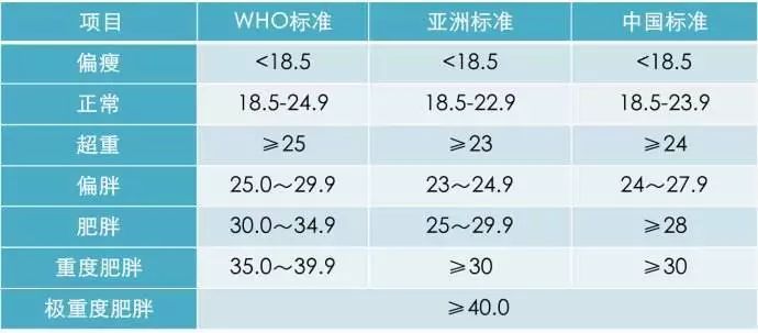 對于中國人來說,正常健康成年人的BMI應(yīng)該在18.5~25.9之間;若BMI在24~28之間,就是偏胖的體型了,可能只是看見小肚腩;若BMI>28,這就是世界衛(wèi)生組織確認(rèn)的肥胖癥,需要引起重視。